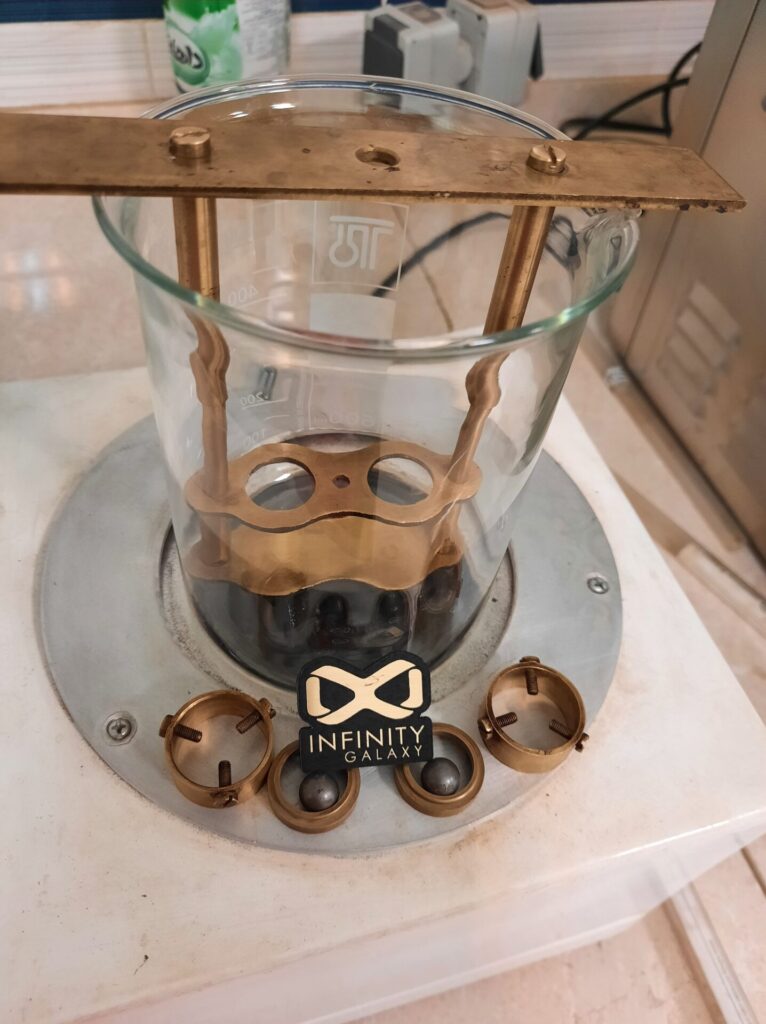 To perform the test, the bitumen sample is taken in two brass rings. Two steel balls are placed on the bitumen samples.